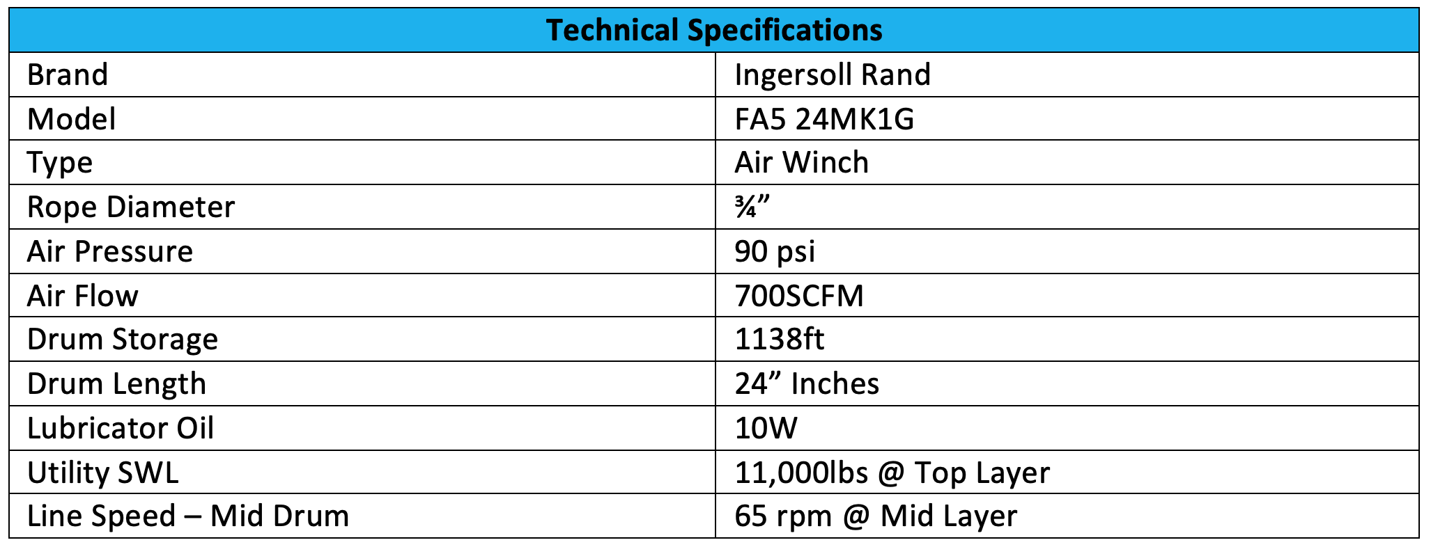 The Ingersoll-Rand FA5 24MK1G is a powerful and dependable air-driven winch, ideal for heavy-duty pulling and lifting tasks in OCS’s offshore construction operations. Built as part of the Third Generation™ air winch series from a premium radial piston motor with rugged cast steel housing, it is rated for 10,000 lb (4,540 kg) line pull at mid-drum, translating to 11,000 lb (5,000 kg) safe working load on the top layer. Designed for precision and control, it features a variable-speed lift-to-shift lever, an internal planetary gear system with built-in drum and disc brakes, and a minimum 18:1 drum-to-rope diameter ratio to reduce rope wear