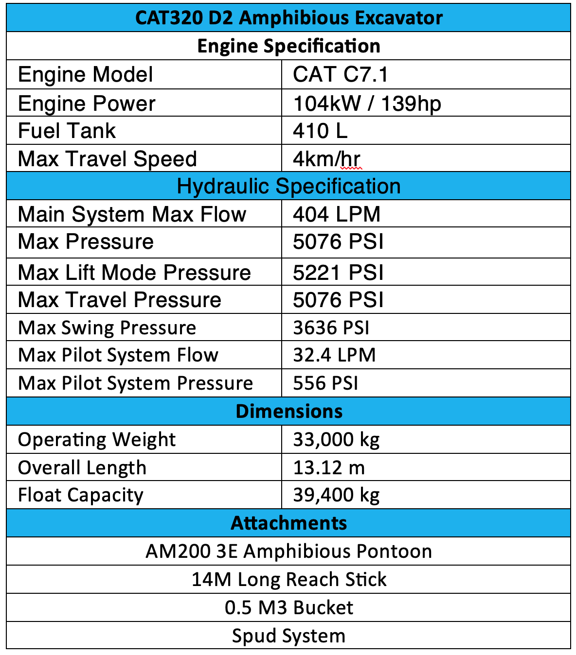 The OCS-owned CAT 320D2 Amphibious Excavator is one of our purpose-built assets added to support nearshore and shoreline excavation works. Fitted with a 14m long reach boom and mounted on a pontoon undercarriage, the excavator is designed to operate in shallow water and soft terrain environments. It is powered by a CAT® C7.1 engine, known for fuel efficiency and dependable performance in marine conditions.