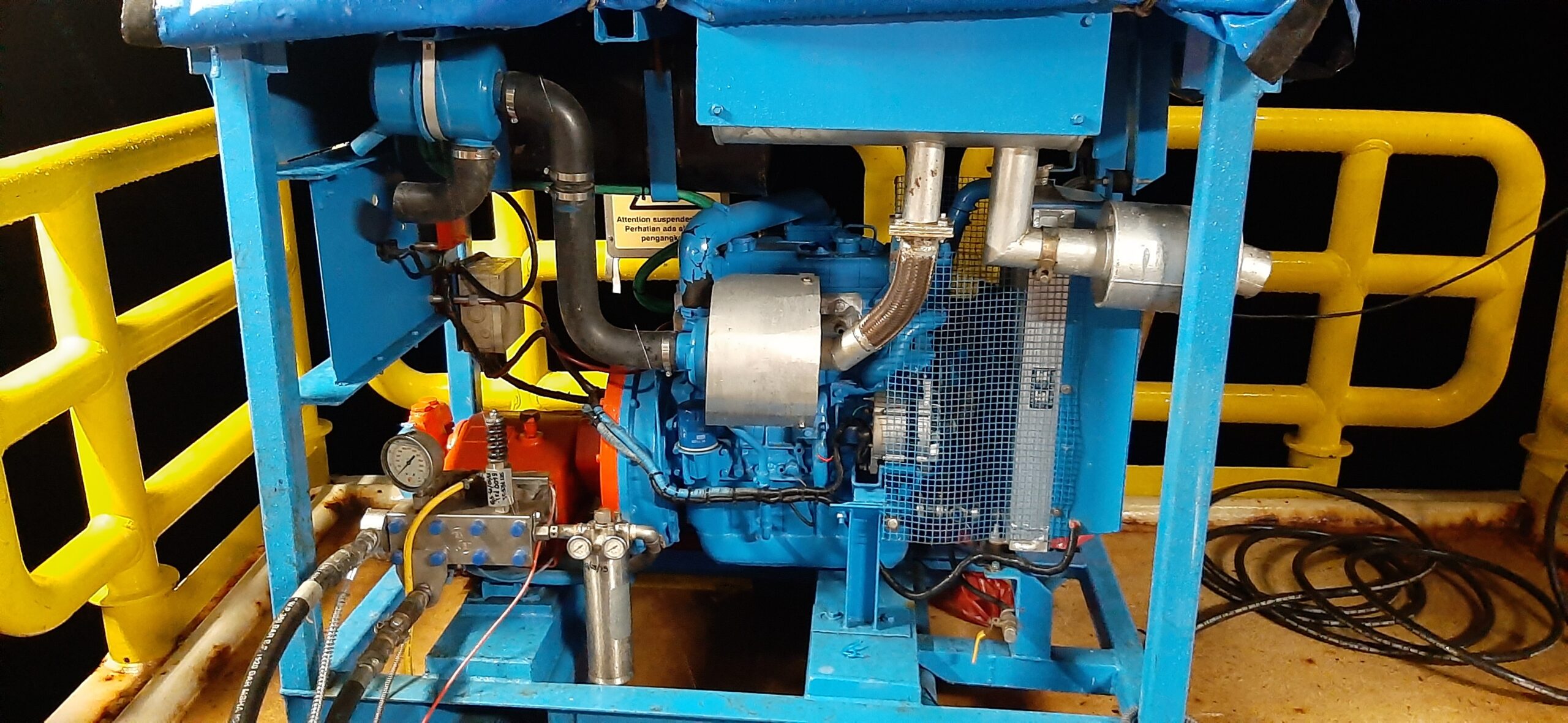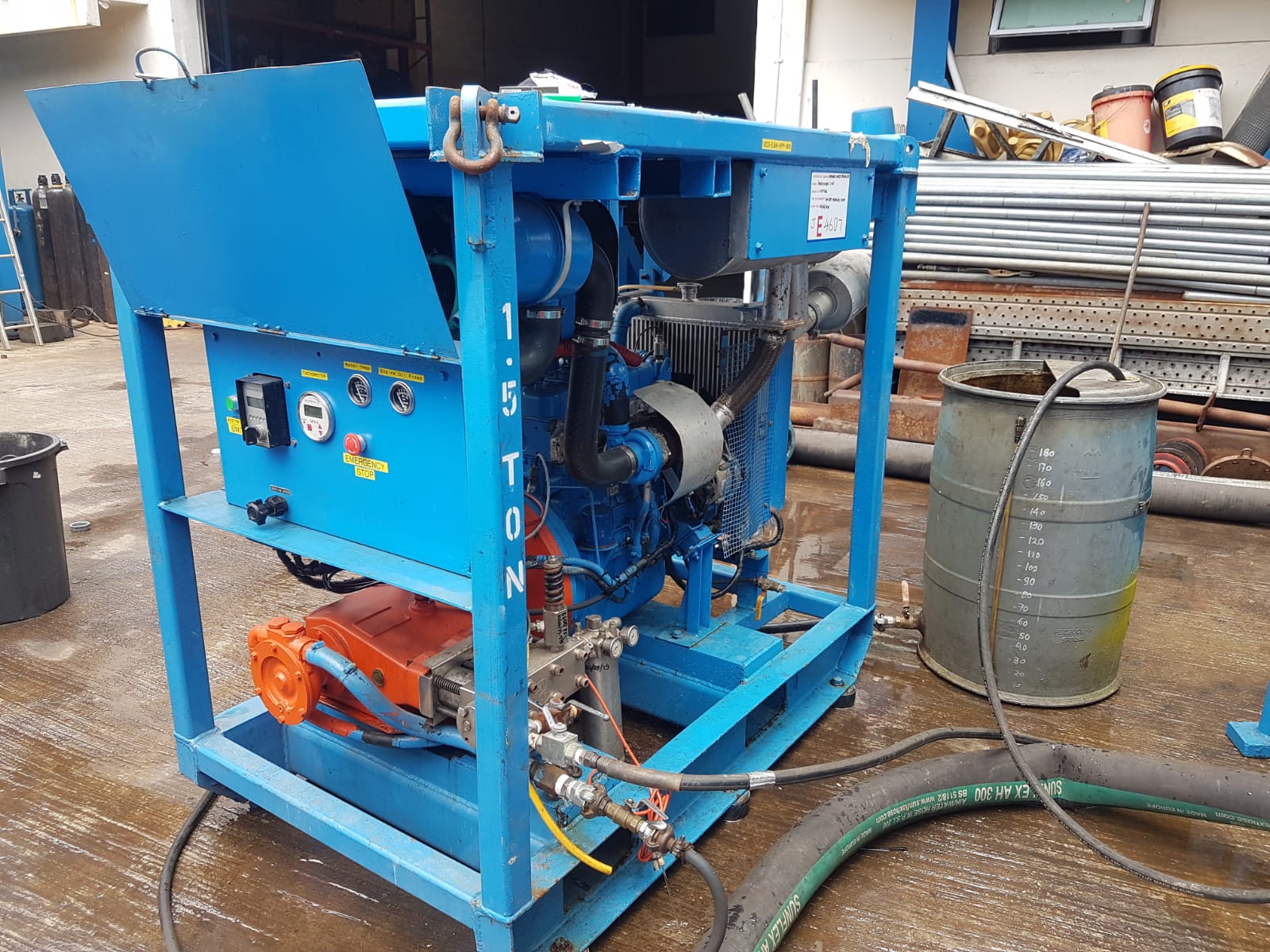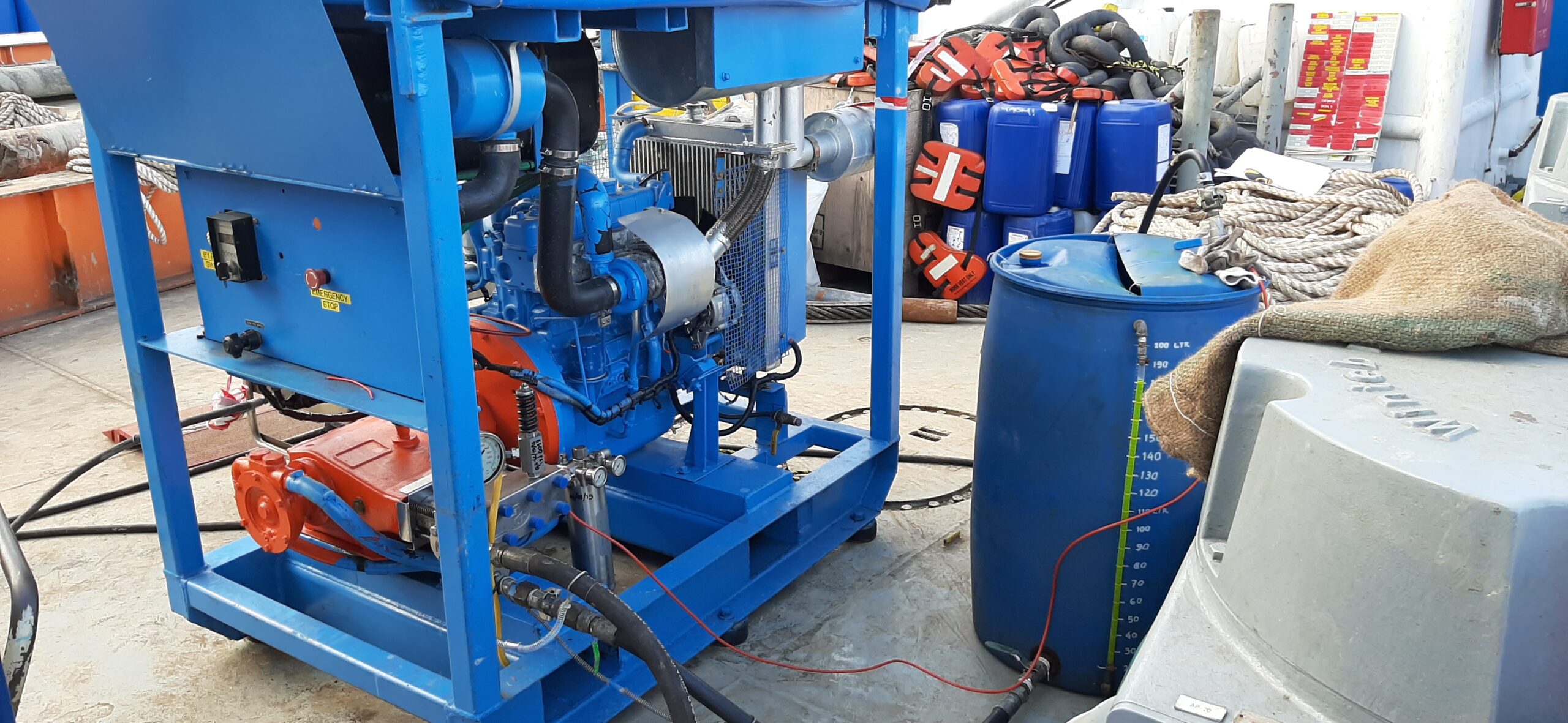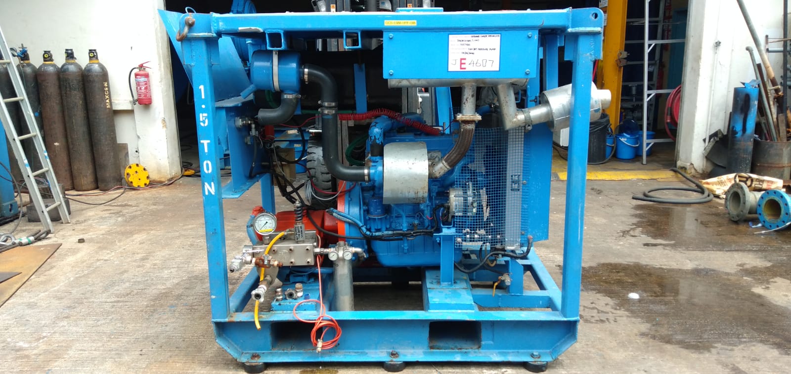 OCS owned Denjet pump is skid mounted pumping unit, which is used for hydro static testing of subsea pipelines and also for the high pressure water blasting cleaning purposes. This pump is a normally used for hydrostatic testing of pipelines with high pressure requirements. OCS’s owns two CD50 series Denjet pump skids. One pump skids is CD50-500 series with an operating pressure of 500bar (7250psi) and the other one is a CD50-1250 series with an operating pressure of 1250bar (18130psi).